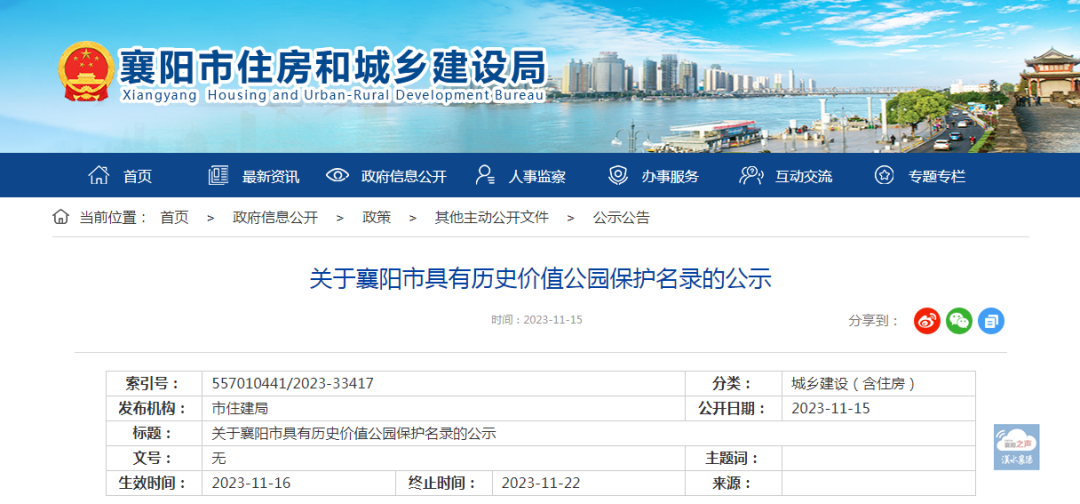 關于襄陽市具有歷史價值公園保護名錄的公示