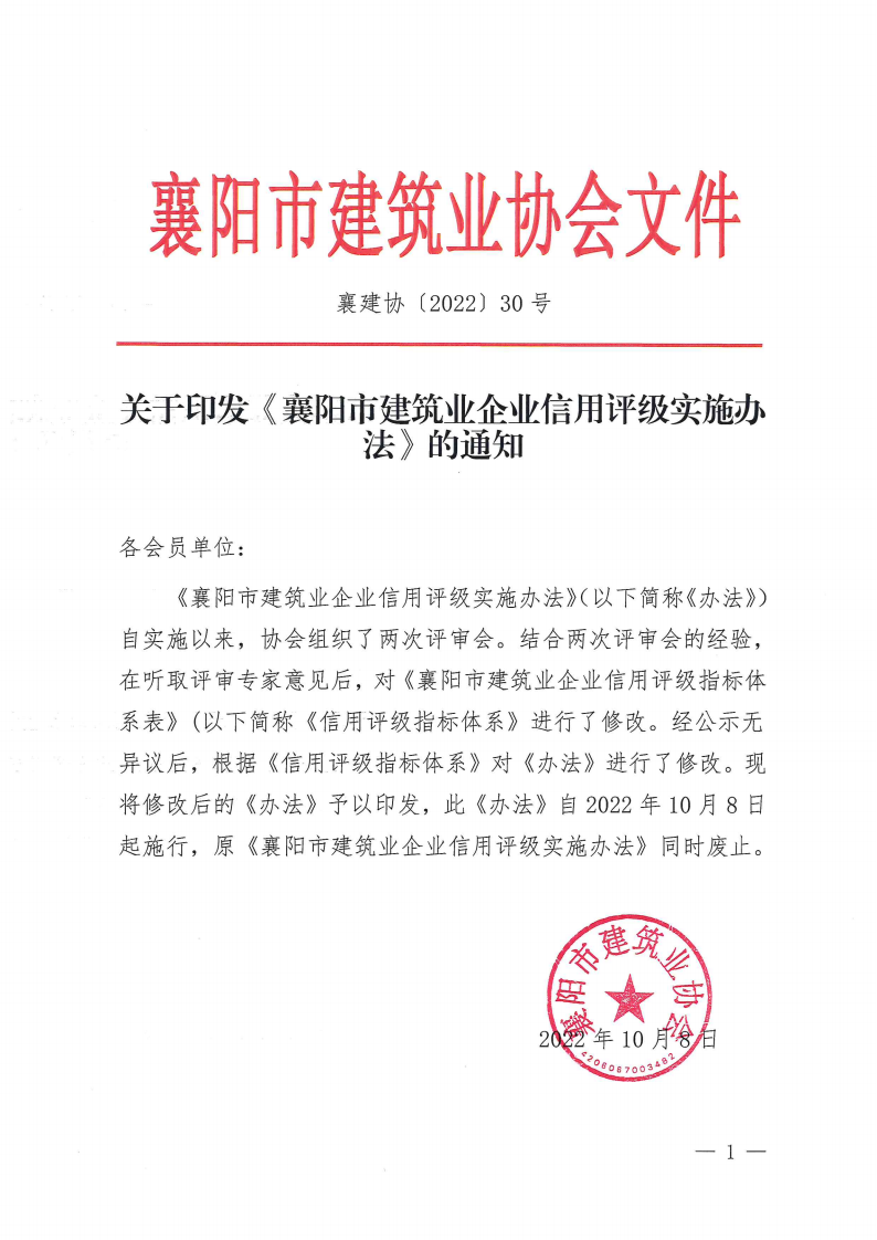 關(guān)于印發(fā)《襄陽(yáng)市建筑業(yè)企業(yè)信用評(píng)級(jí)實(shí)施辦法》的通知