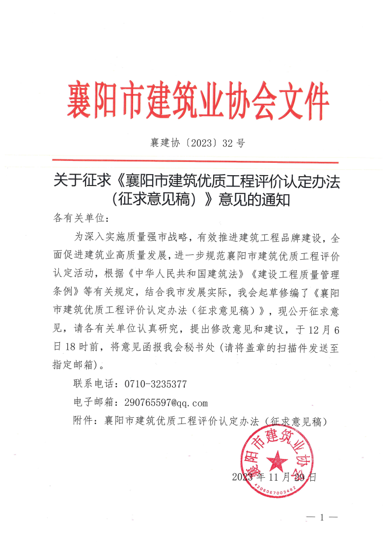 為深入實施質量強市戰略,有效推進建筑工程品牌建設,全面促進建筑業高質量發展,進一步規范襄陽市建筑優質工程評價認定活動,根據《中華人民共和國建筑法》《建設工程質量管理條例》等有關規定,結合我市發展實際,我會起草修編了《襄陽市建筑優質工程評價認定辦法(征求意見稿)》,現公開征求意見,請各有關單位認真研究,提出修改意見和建議,于12月6日18時前,將意見函報我會秘書處 (請將蓋章的掃描件發送至指定郵箱)。