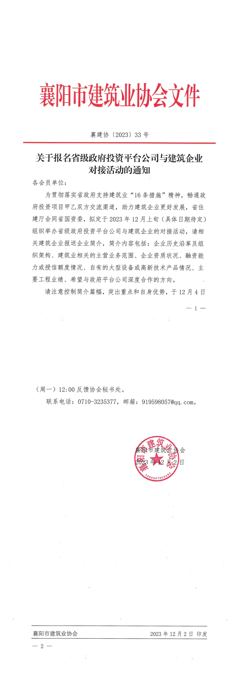 為貫徹落實省政府支持建筑業“16條措施”精神,暢通政府投資項目甲乙雙方交流渠道,助力建筑企業更好發展,省住建廳會同省國資委,擬定于2023年12月上旬(具體日期待定)組織舉辦省級政府投資平臺公司與建筑企業的對接活動,請相關建筑企業報送企業簡介,簡介內容包括:企業歷史沿革及組織架構、建筑業相關的主營業務范圍、企業資質狀況、融資能力或授信額度情況、自有的大型設備或高新技術產品情況、主要工程業績、希望與政府平臺公司深度合作的方向。