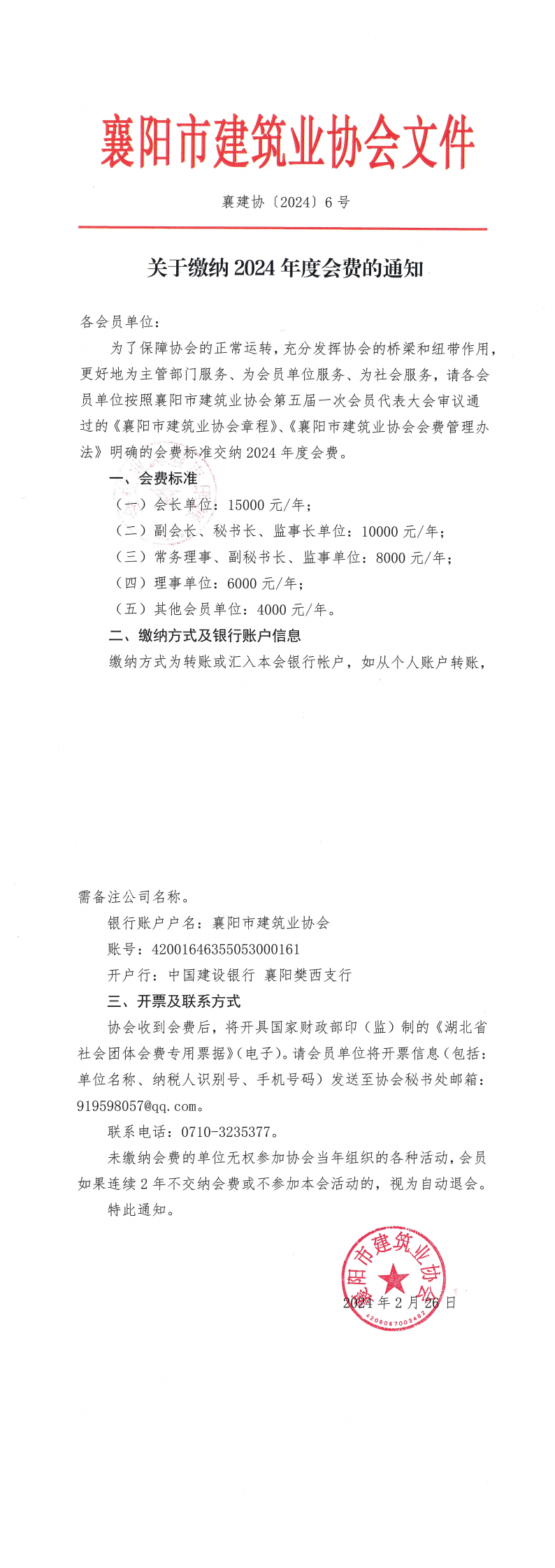 為了保障協會的正常運轉,充分發揮協會的橋梁和紐帶作用,更好地為主管部門服務、為會員單位服務、為社會服務,請各會員單位按照襄陽市建筑業協會第五屆一次會員代表大會審議通過的《襄陽市建筑業協會章程》、《襄陽市建筑業協會會費管理辦法》明確的會費標準交納2024年度會費。