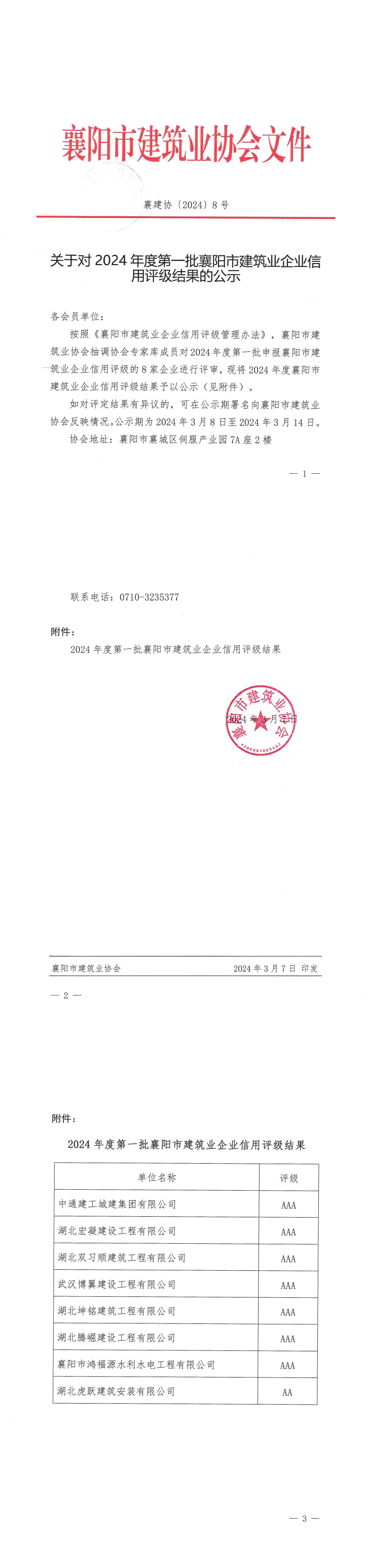 關(guān)于對2024年度第一批襄陽市建筑業(yè)企業(yè)信用評級結(jié)果的公示