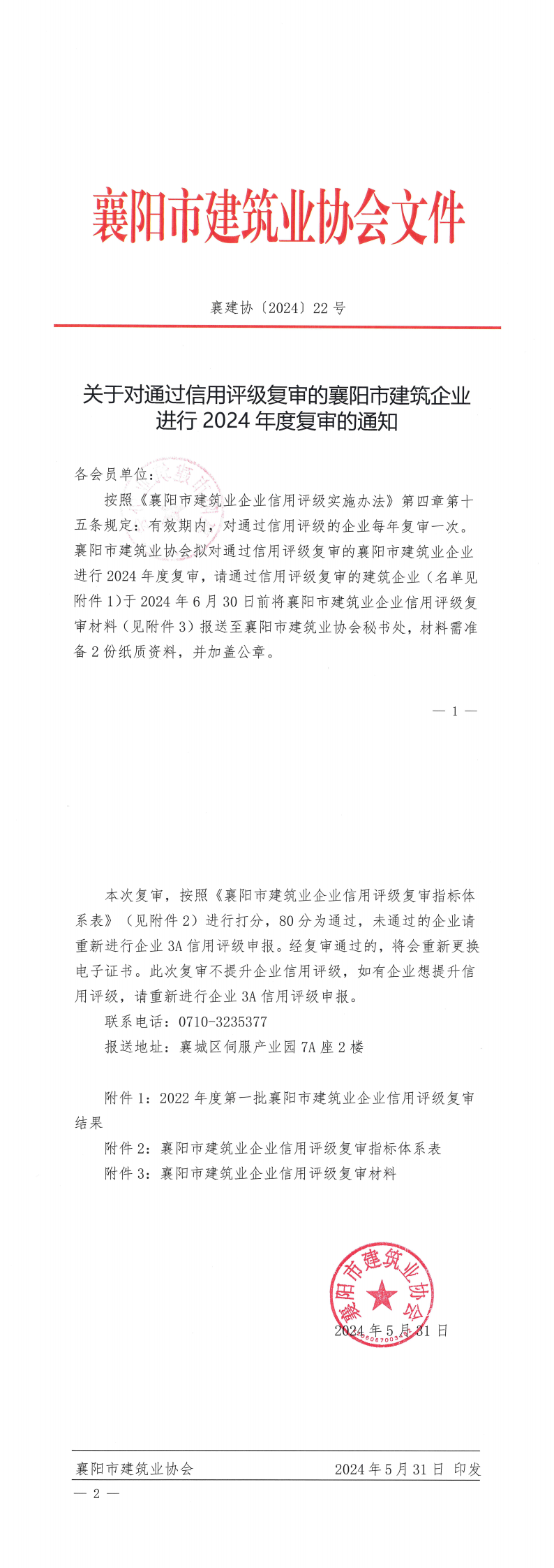 關(guān)于對通過信用評級復(fù)審的襄陽市建筑企業(yè)進(jìn)行2024年度復(fù)審的通知