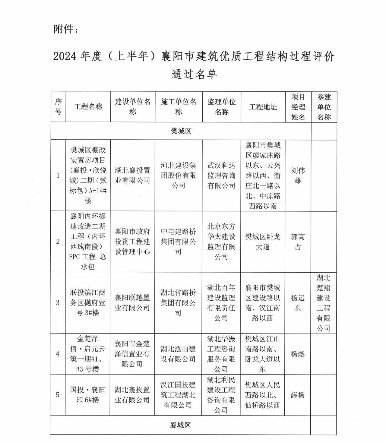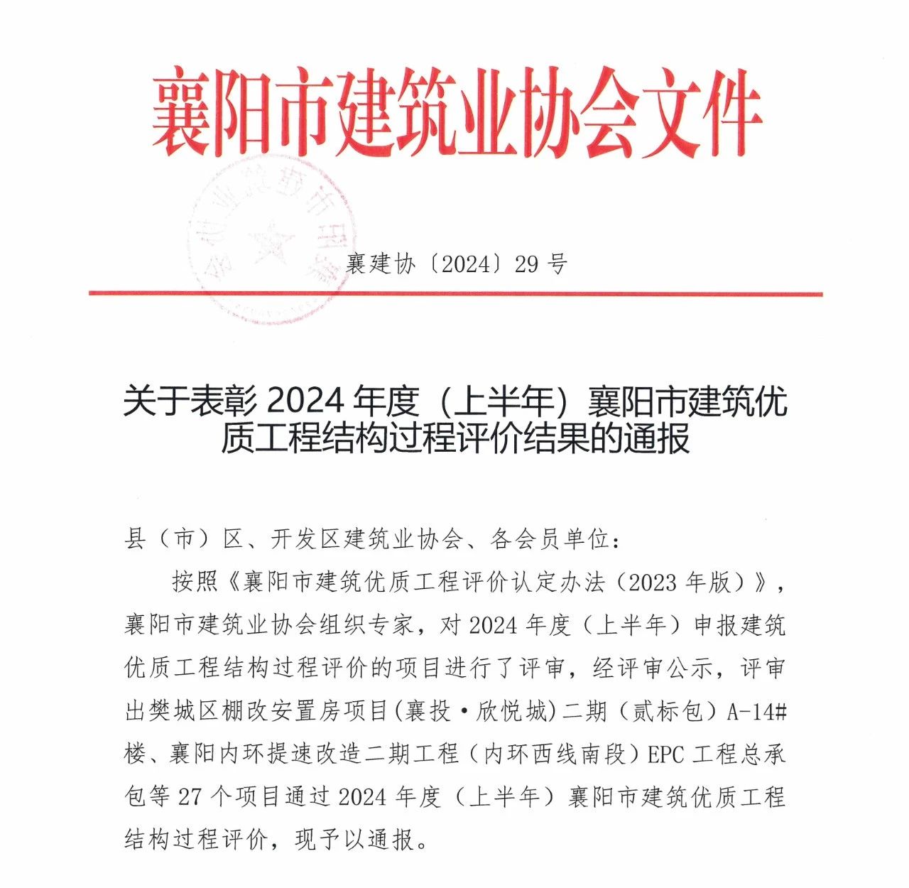 關(guān)于表彰 2024 年度(上半年)襄陽市建筑優(yōu)質(zhì)工程結(jié)構(gòu)過程評價(jià)結(jié)果的通報(bào)