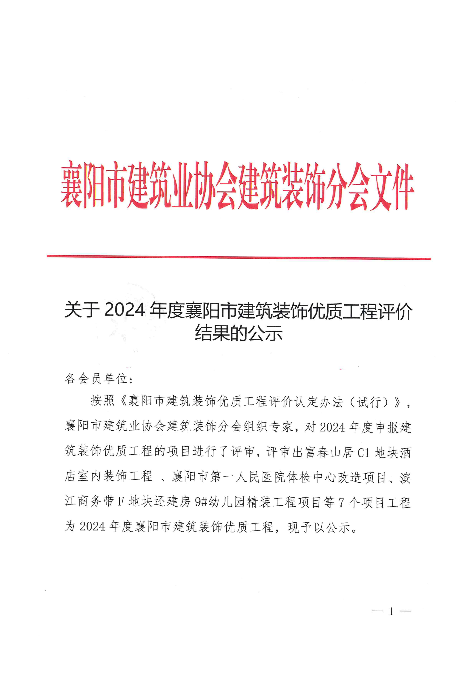 關(guān)于 2024 年度襄陽市建筑裝飾優(yōu)質(zhì)工程評價(jià)結(jié)果的公示