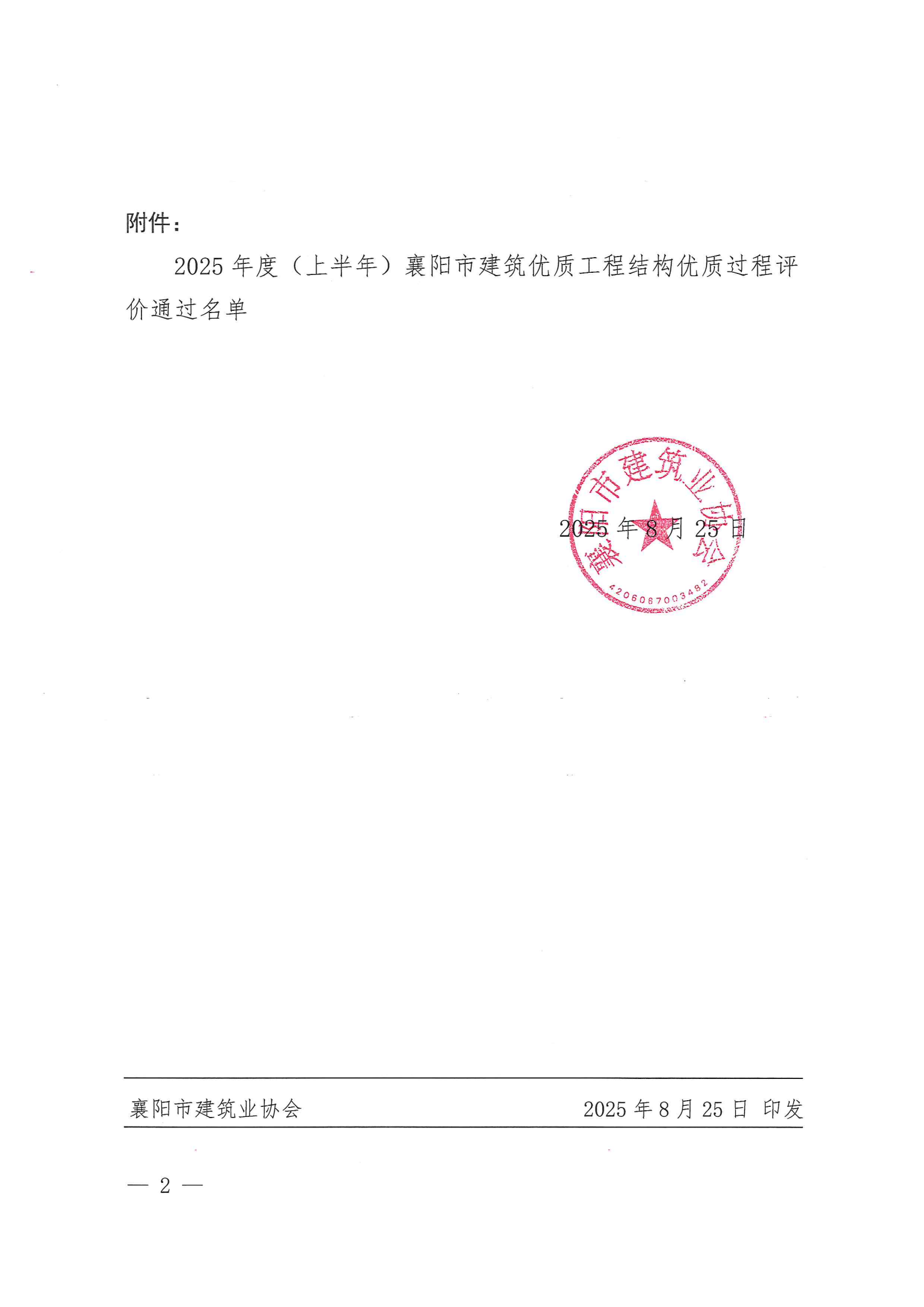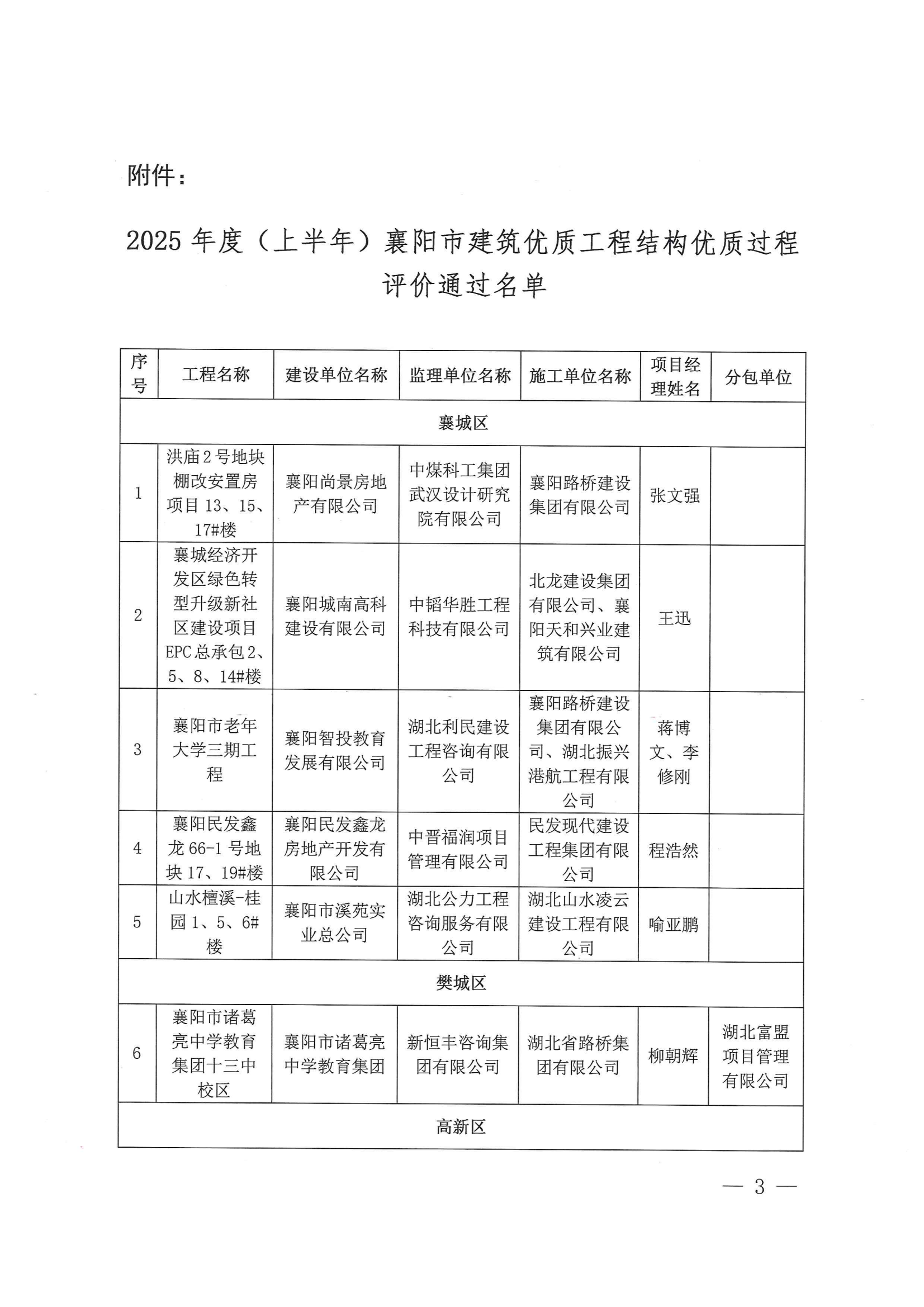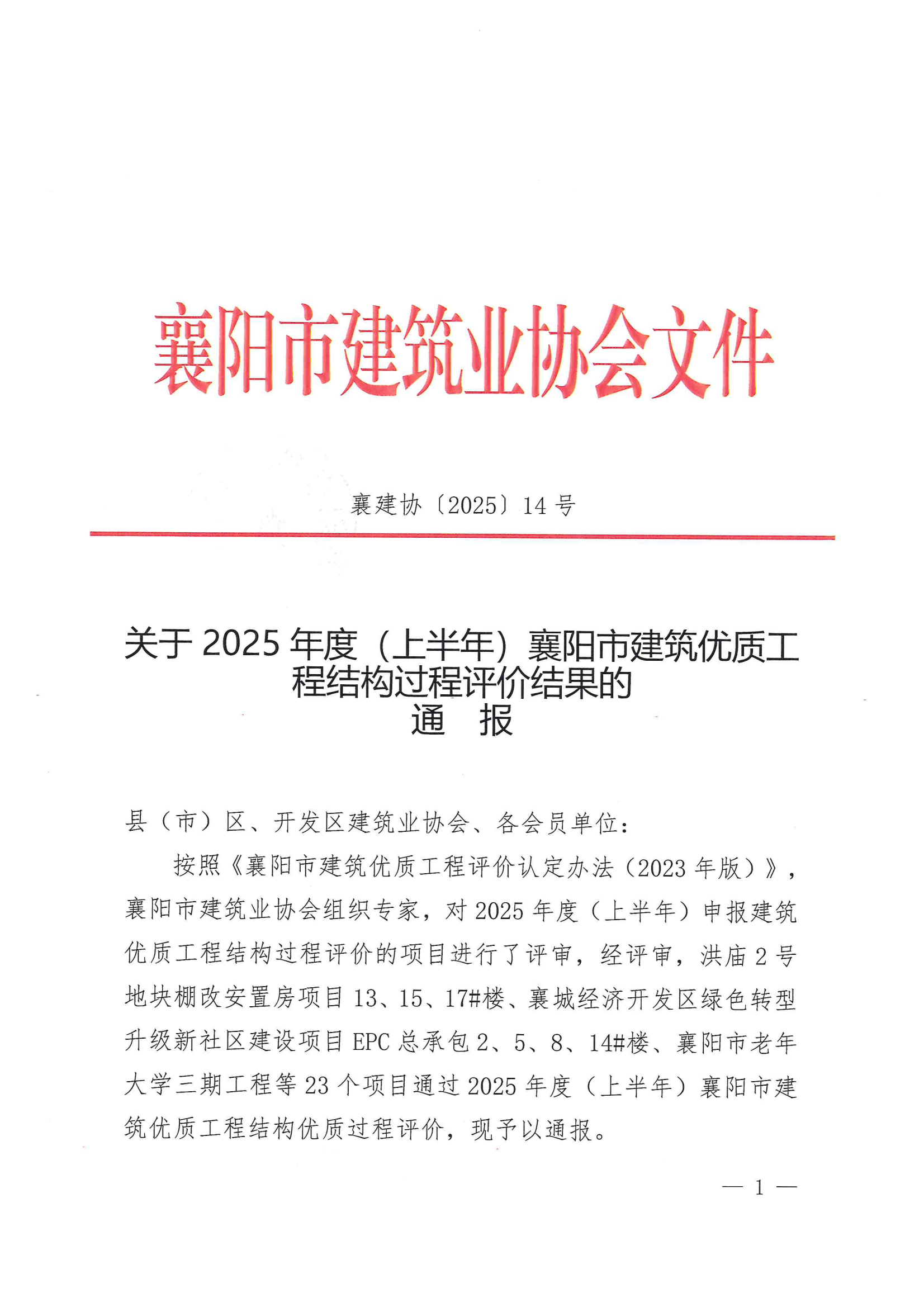 關于 2025 年度(上半年)襄陽市建筑優(yōu)質(zhì)工程結(jié)構(gòu)過程評價結(jié)果的通報