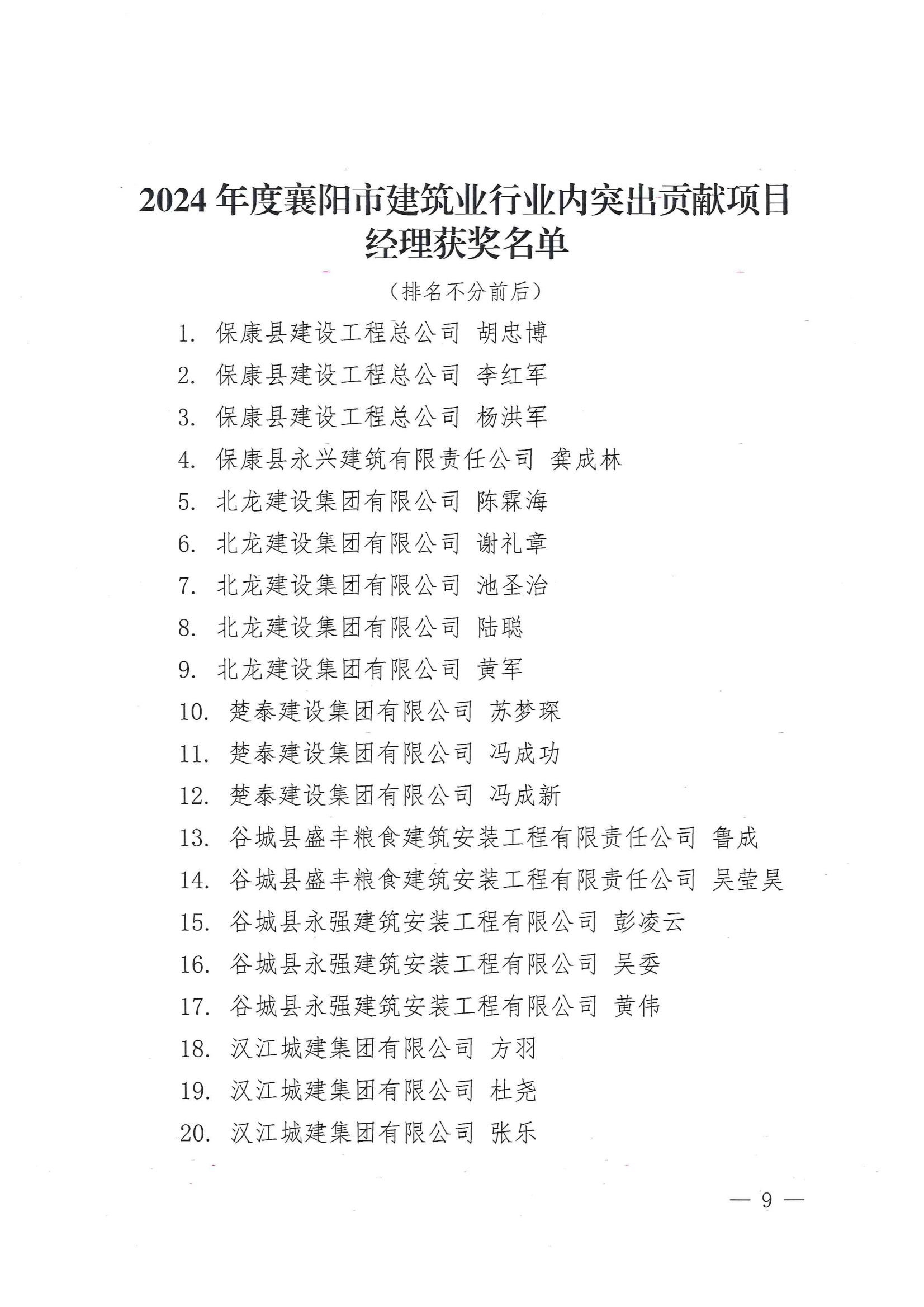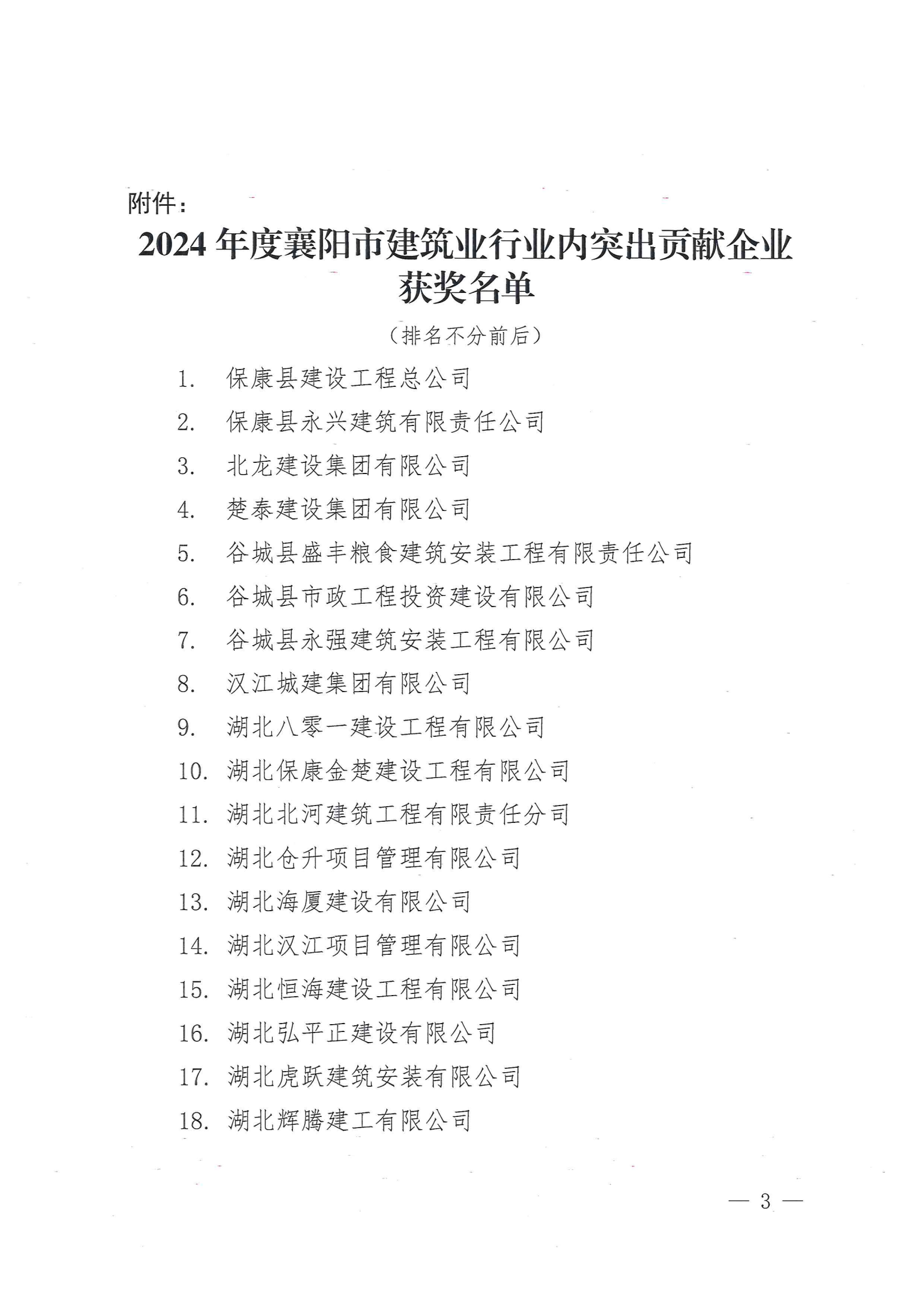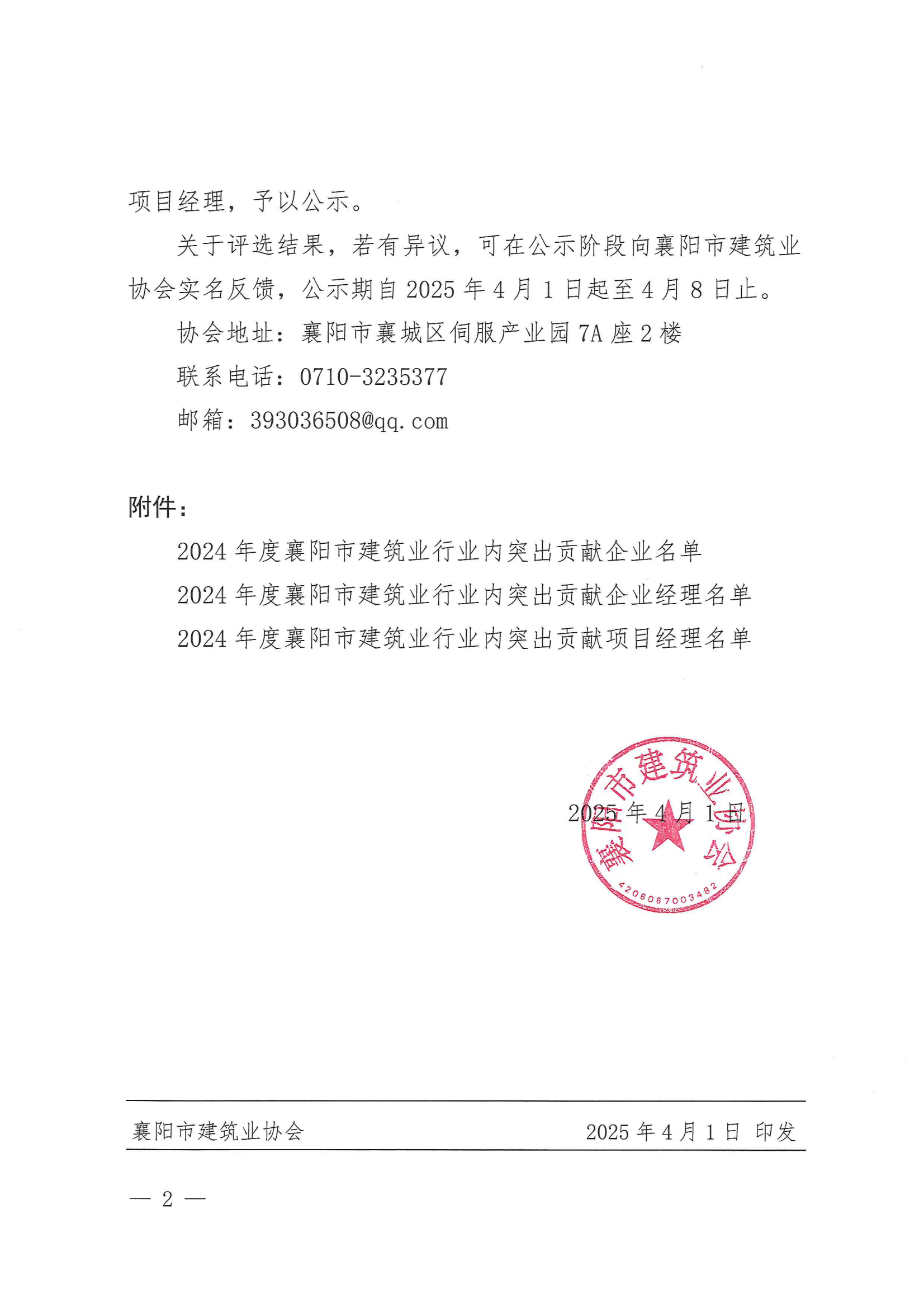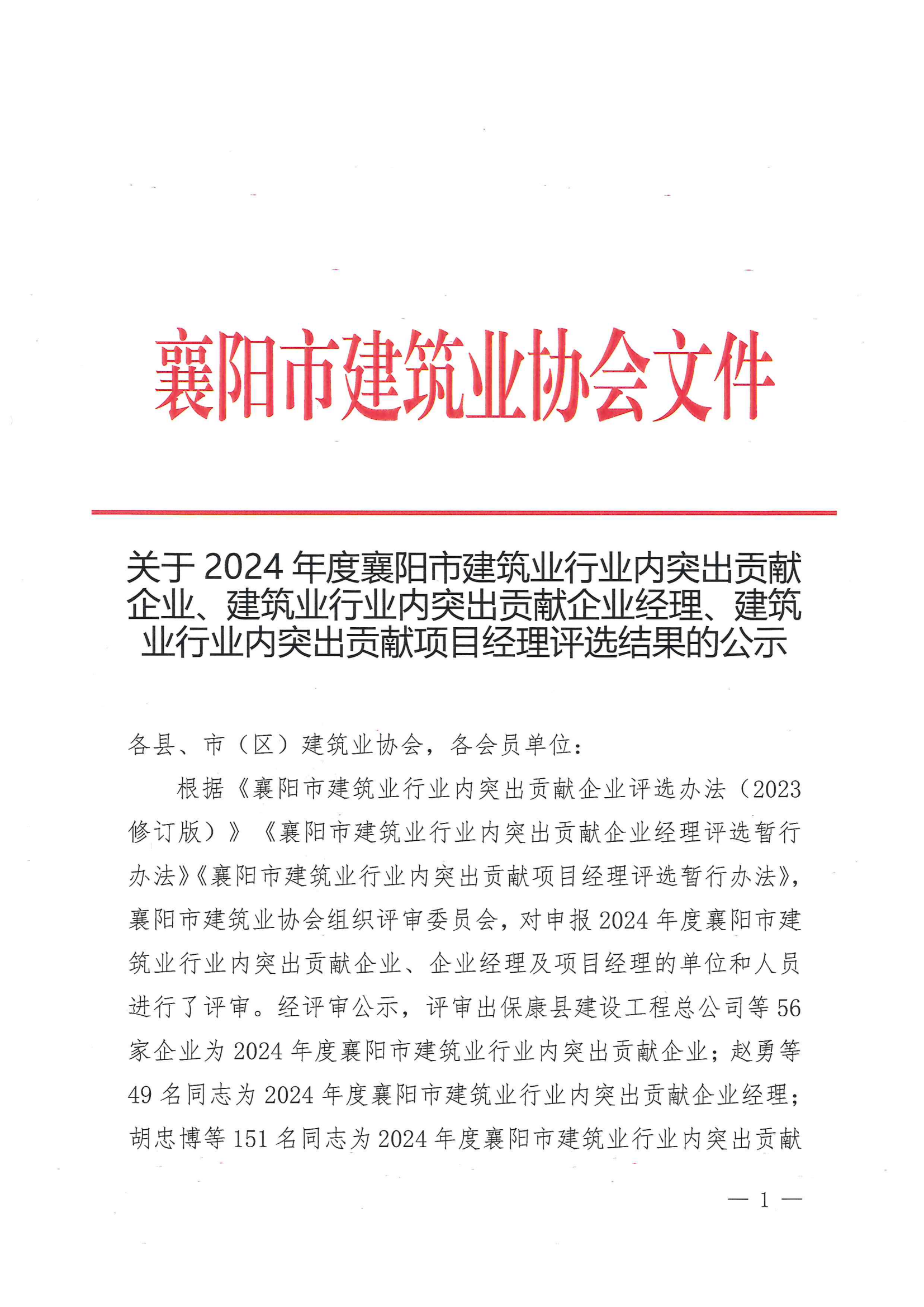 關于2024年度襄陽市建筑業(yè)行業(yè)內(nèi)突出貢獻企業(yè)、建筑業(yè)行業(yè)內(nèi)突出貢獻企業(yè)經(jīng)理、建筑業(yè)行業(yè)內(nèi)突出貢獻項目經(jīng)理評選結(jié)果的公示