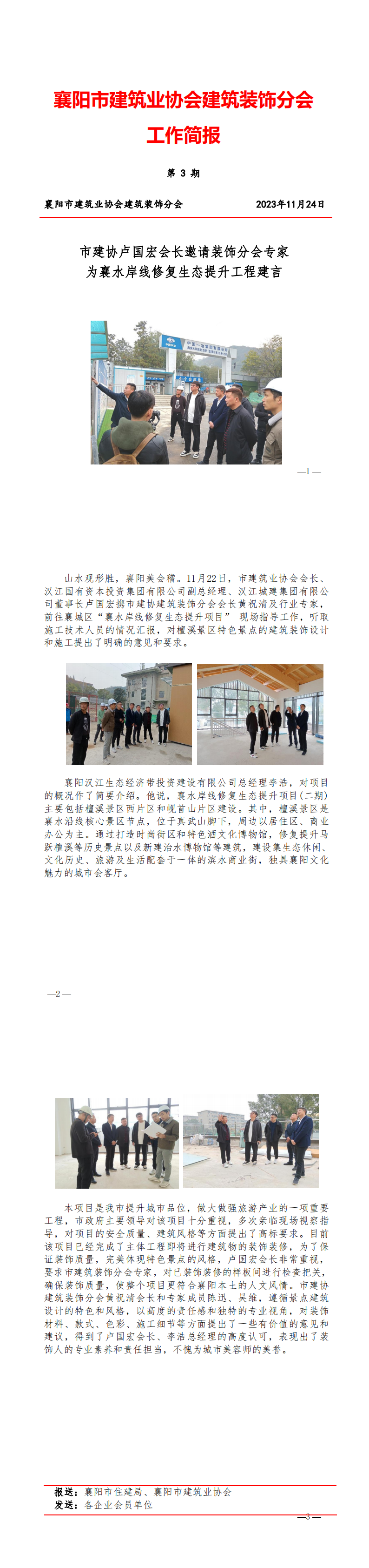 山水觀形勝,襄陽美會稽。11月22日,市建筑業協會會長、漢江國有資本投資集團有限公司副總經理、漢江城建集團有限公司董事長盧國宏攜市建協建筑裝飾分會會長黃祝清及行業專家,前往襄城區“襄水岸線修復生態提升項目” 現場指導工作,聽取施工技術人員的情況匯報,對檀溪景區特色景點的建筑裝飾設計和施工提出了明確的意見和要求。