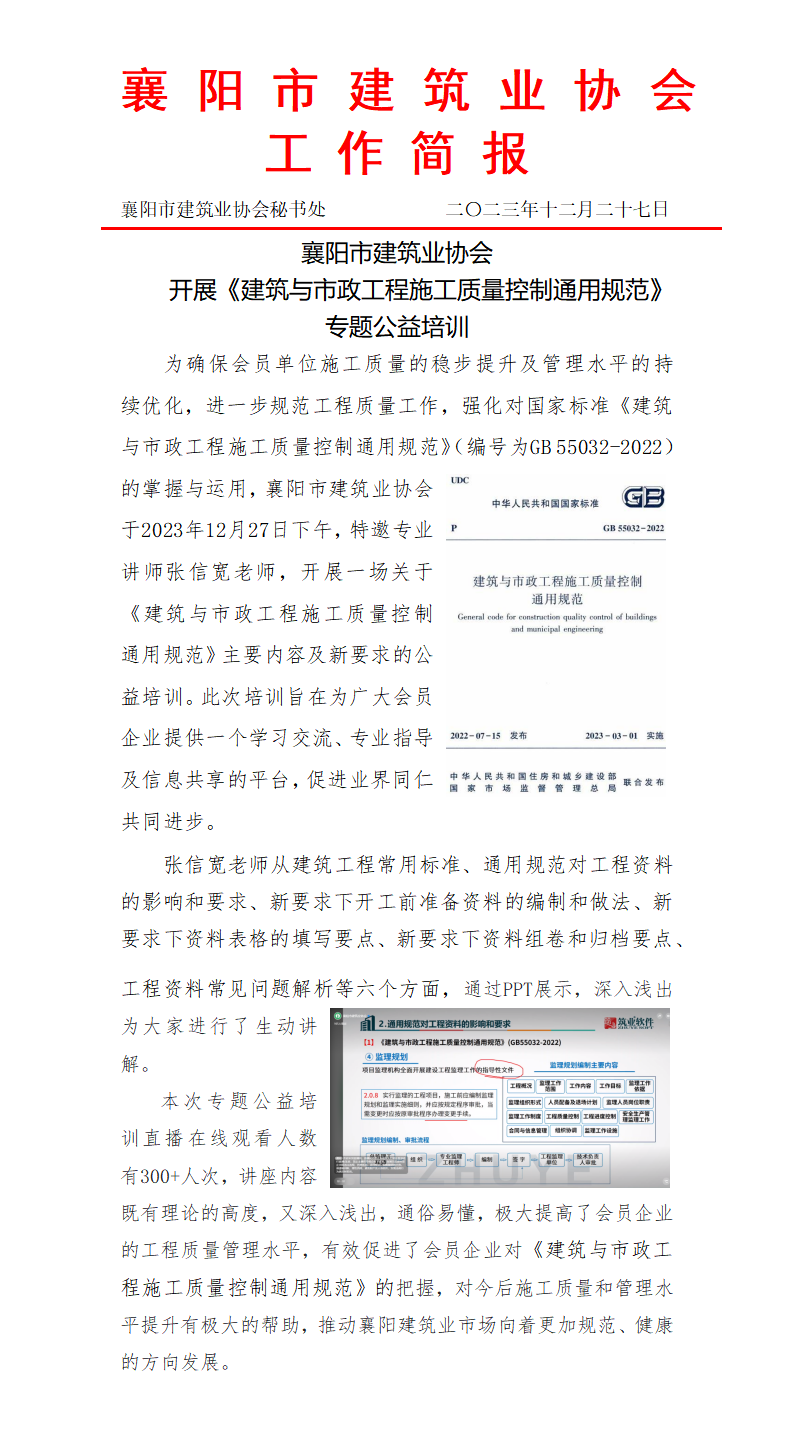 本次專題公益培訓(xùn)直播在線觀看人數(shù)有300+人次,講座內(nèi)容既有理論的高度,又深入淺出,通俗易懂,極大提高了會員企業(yè)的工程質(zhì)量管理水平,有效促進(jìn)了會員企業(yè)對《建筑與市政工程施工質(zhì)量控制通用規(guī)范》的把握,對今后施工質(zhì)量和管理水平提升有極大的幫助,推動襄陽建筑業(yè)市場向著更加規(guī)范、健康的方向發(fā)展。
